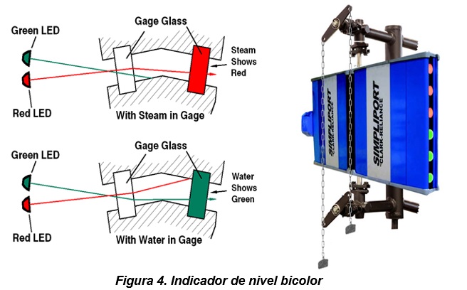 - El mecanismo del indicador funciona basado en la diferencia de refracción de la luz a través del agua o el vapor contenidos en una cámara, entre vidrios colocados en ángulos específicos. Si a través de la cámara pasa el haz rojo, el fluido es vapor, si pasa el haz verde, el fluido es agua.