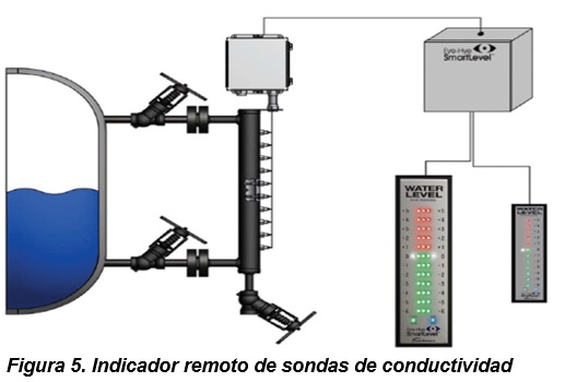 - El dispositivo consiste en un arreglo de sondas que provee una representación incremental del nivel. Las sondas detectan la presencia de agua eléctricamente, debido a la diferencia de conductividad existente entre el agua y el vapor.