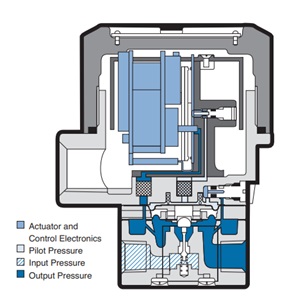 El modelo 950XP utiliza una boquilla para controlar la presión piloto de un amplificador de volumen integral. La presión de salida resultante se mide mediante un sensor de presión, que a su vez proporciona una señal de retroalimentación al circuito de control.