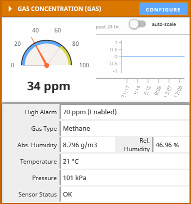 El RANGER-AirQ es un sensor ambiental completo, ya que además del contenido de CH4 (en un rango de 50 a 1.000.000 ppm = 100% CH4), reporta la temperatura ambiente, la presión atmosférica, la humedad relativa y la humedad absoluta.