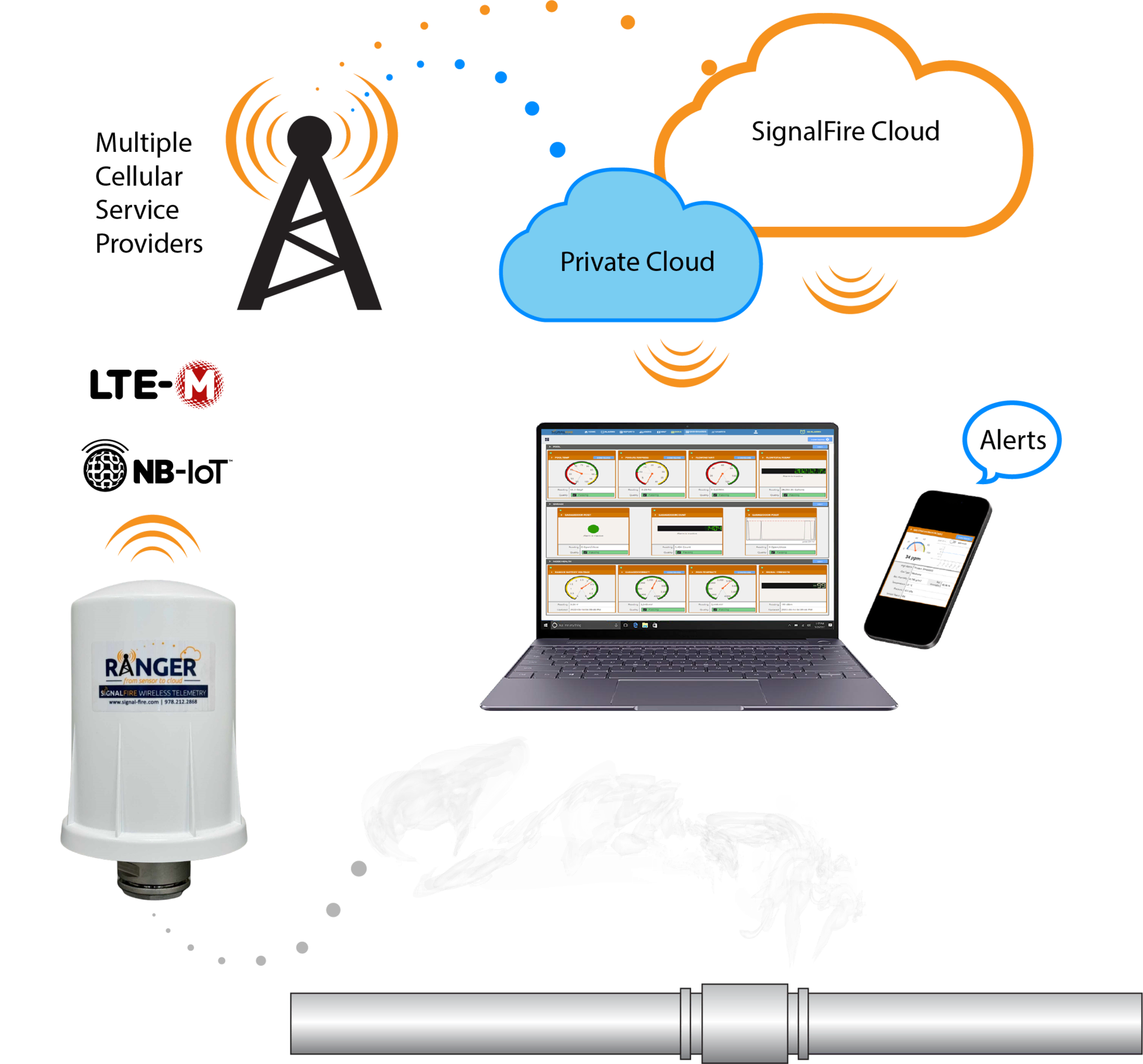 Como está basado en la conocida plataforma RANGER, es un sensor completamente autónomo, apto para áreas clasificadas, alimentado con sus baterías internas, incluye comunicación a través de la red celular con tecnología LTE/M1 y NB-IoT, cuenta con GPS incorporado para geolocalizar la medición, y se integra fácilmente a la nube de SignalFire para que el usuario pueda acceder a los datos.