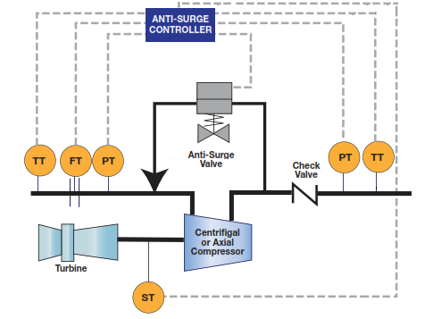 Estos sistemas normalmente requieren mediciones del caudal de succión, velocidad de rotación, y además las presiones y temperaturas, tomadas de ambos lados del compresor. Un punto crítico de este lazo de control es el actuador que maneja la válvula, el cual tiene gran influencia en el desempeño del lazo.