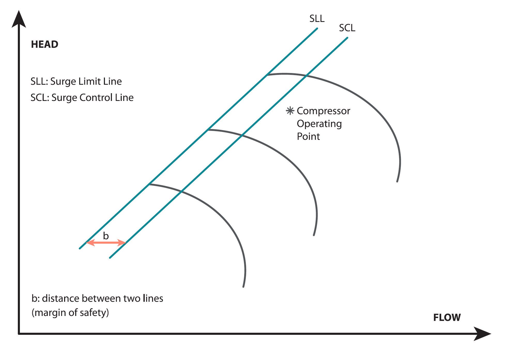 En la teoría moderna de control de compresores, se traza sobre la gráfica de rendimiento del compresor la línea de surge (SLL) y la anti-surge (SCL). Estas líneas están separadas por un margen de seguridad que depende del proceso y la aplicación, pero típicamente se encuentra en alrededor del 10%.