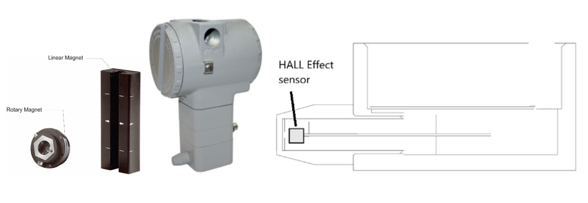 El cuerpo del transmisor no se modifica según la aplicación, solo se elige el imán adecuado entre 3 opciones para movimientos lineales, o la opción rotativa. Un indicador LCD opcional permite visualizar la posición localmente si fuera necesario.