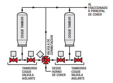 La función principal de la válvula de 4 vías de conmutación del tambor de coque, comunmente identificada con “switch valve”, es desviar la corriente de alimentación de un tambor a otro.